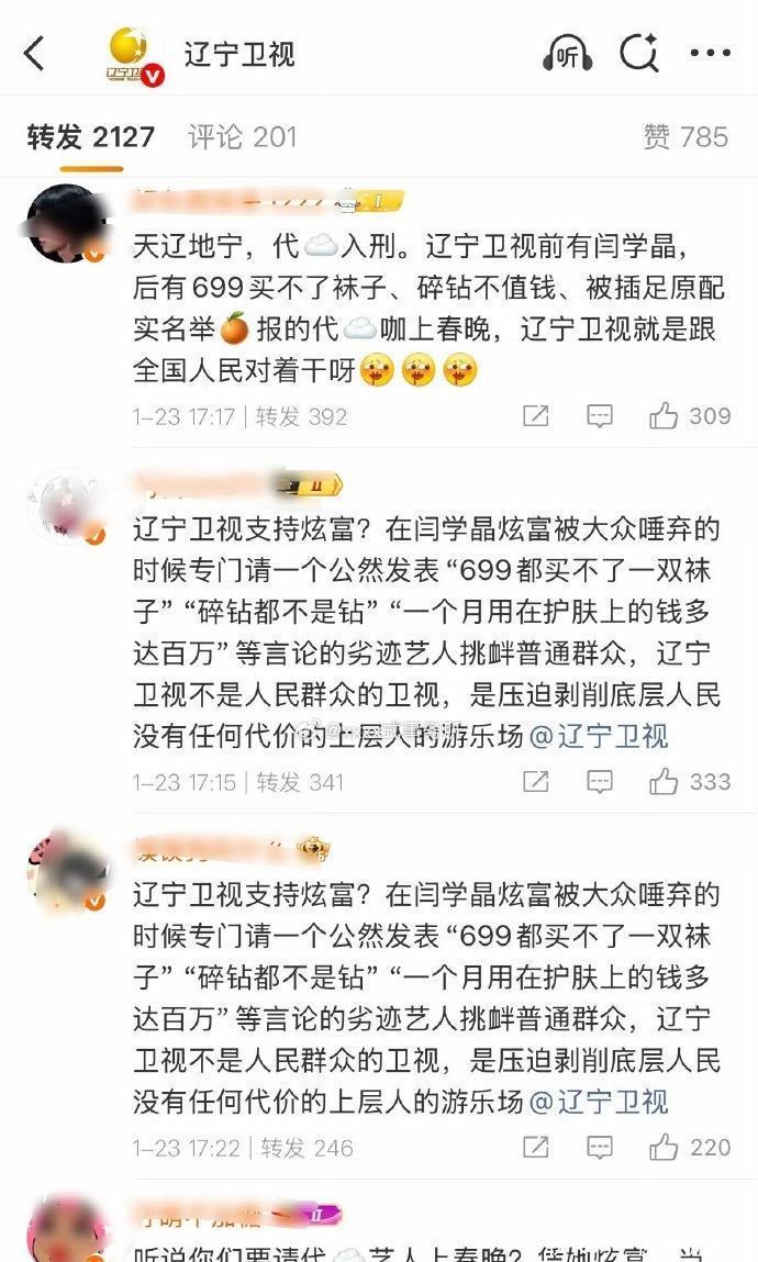 “699元买不了一双袜子的人,也好意思上春晚?”“闫学晶刚走,又来个更炸裂的炫富咖,辽视是跟大众对着干?”各种抵制言论刷屏,甚至有网友直接刷起“山海有情,代孕入刑”的标语,把陈年旧瓜也翻了出来。